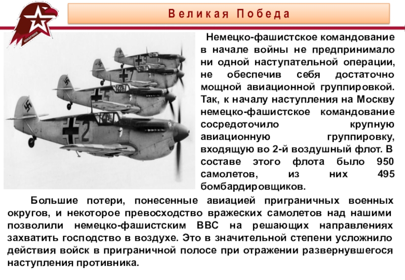 Немецко-фашистское командование в начале войны не предпринимало ни одной наступательной операции, не обеспечив себя достаточно мощной авиационной группировкой. Так, к началу наступления на Москву немецко-фашистское командование сосредоточило крупную авиационную группировку, входящую во 2-й воздушный флот. В составе этого флота было 950 самолетов, из них 495 бомбардировщиков.