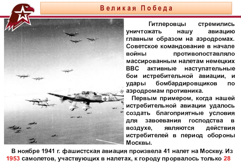 В ноябре 1941 г. фашистская авиация произвела 41 налет на Москву. Из 1953 самолетов, участвующих в налетах, к городу прорвалось только 28