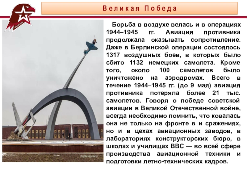 Борьба в воздухе велась и в операциях 1944–1945 гг. Авиация противника продолжала оказывать сопротивление. Даже в Берлинской операции состоялось 1317 воздушных боев, в которых было сбито 1132 немецких самолета. Кроме того, около 100 самолетов было уничтожено на аэродромах. Всего в течение 1944–1945 гг. (до 9 мая) авиация противника потеряла более 21 тыс. самолетов. Говоря о победе советской авиации в Великой Отечественной войне, всегда необходимо помнить, что ковалась она не только на фронте в и сражениях, но и в цехах авиационных заводов, в лабораториях конструкторских бюро, в школах и училищах ВВС — во всей сфере производства авиационной техники и подготовки летно-технических кадров.
