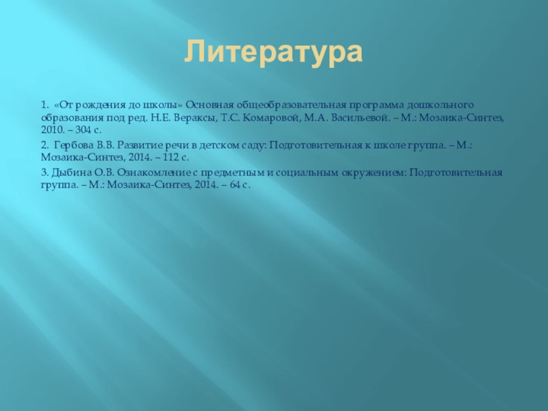 Литература1. «От рождения до школы» Основная общеобразовательная программа дошкольного образования под ред. Н.Е. Вераксы, Т.С. Комаровой, М.А. Васильевой.