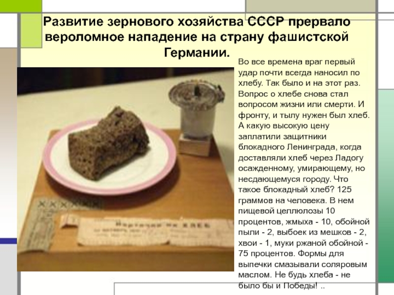 Во все времена враг первый удар почти всегда наносил по хлебу. Так было и на этот раз. Вопрос о хлебе снова стал вопросом жизни или смерти. И фронту, и тылу нужен был хлеб. А какую высокую цену заплатили защитники блокадного Ленинграда, когда доставляли хлеб через Ладогу осажденному, умирающему, но несдающемуся городу. Что такое блокадный хлеб? 125 граммов на человека. В нем пищевой целлюлозы 10 процентов, жмыха - 10, обойной пыли - 2, выбоек из мешков - 2, хвои - 1, муки ржаной обойной - 75 процентов. Формы для выпечки смазывали соляровым маслом. Не будь хлеба - не было бы и Победы! ..