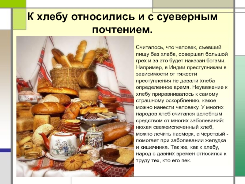 человек, съевший пищу без хлеба, совершал большой грех и за это будет наказан богами. Например, в Индии преступникам в зависимости от тяжести преступления не давали хлеба определенное время. Неуважение к хлебу приравнивалось к самому страшному оскорблению, какое можно нанести человеку. У многих народов хлеб считался целебным средством от многих заболеваний: нюхая свежеиспеченный хлеб, можно лечить насморк, а черствый - помогает при заболевании желудка и кишечника. Так же, как к хлебу, народ с давних времен относился к труду тех, кто его пек.