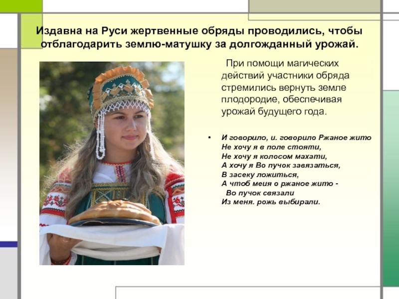 Слайд 11Издавна на Руси жертвенные обряды проводились, чтобы отблагодарить землю-матушку за долгожданный