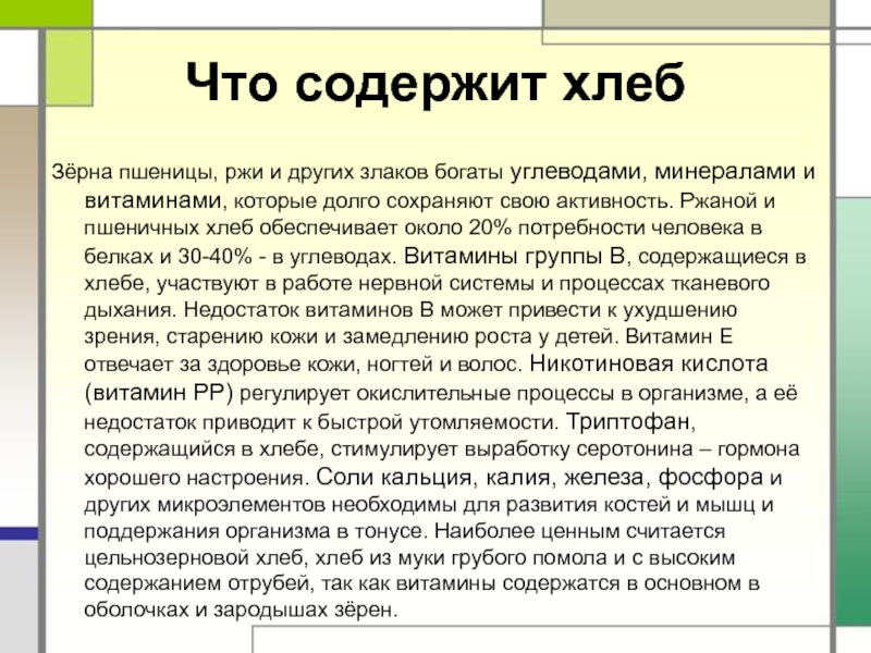 и витаминами, которые долго сохраняют свою активность. Ржаной и пшеничных хлеб обеспечивает около 20% потребности человека в белках и 30-40% - в углеводах. Витамины группы В, содержащиеся в хлебе, участвуют в работе нервной системы и процессах тканевого дыхания. Недостаток витаминов В может привести к ухудшению зрения, старению кожи и замедлению роста у детей. Витамин Е отвечает за здоровье кожи, ногтей и волос. Никотиновая кислота (витамин РР) регулирует окислительные процессы в организме, а её недостаток приводит к быстрой утомляемости. Триптофан, содержащийся в хлебе, стимулирует выработку серотонина – гормона хорошего настроения. Соли кальция, калия, железа, фосфора и других микроэлементов необходимы для развития костей и мышц и поддержания организма в тонусе. Наиболее ценным считается цельнозерновой хлеб, хлеб из муки грубого помола и с высоким содержанием отрубей, так как витамины содержатся в основном в оболочках и зародышах зёрен.
