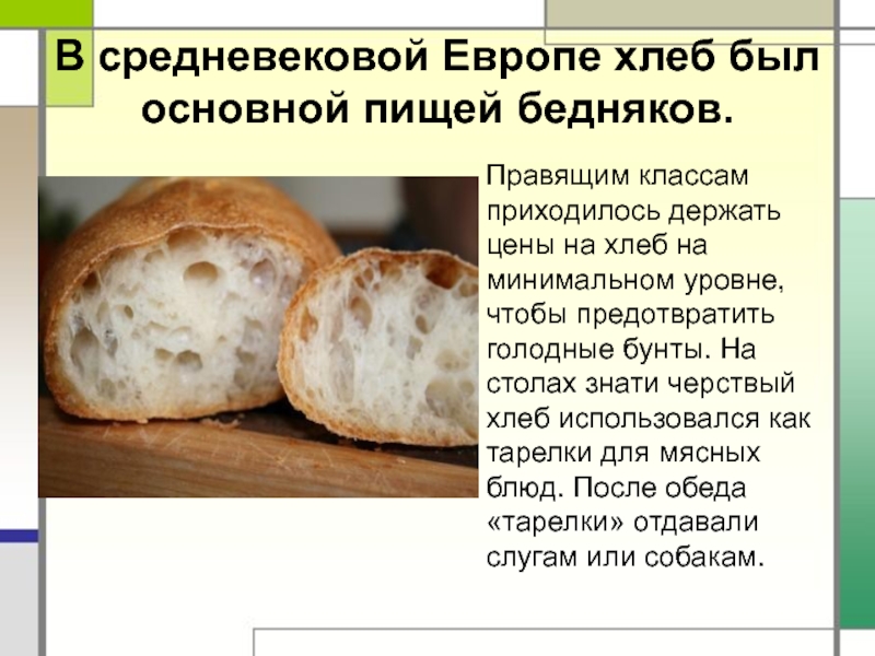приходилось держать цены на хлеб на минимальном уровне, чтобы предотвратить голодные бунты. На столах знати черствый хлеб использовался как тарелки для мясных блюд. После обеда «тарелки» отдавали слугам или собакам.