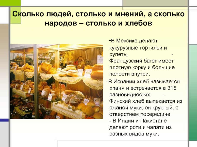 -В Мексике делают кукурузные тортильи и рулеты. -Французский багет имеет плотную корку и большие полости внутри.