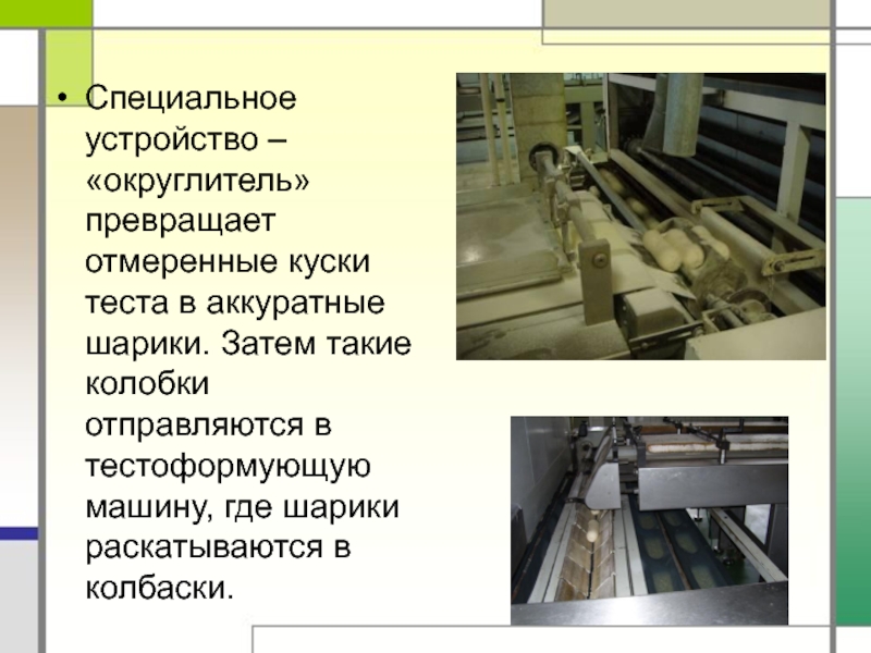 Слайд 17Специальное устройство – «округлитель» превращает отмеренные куски теста в аккуратные шарики.