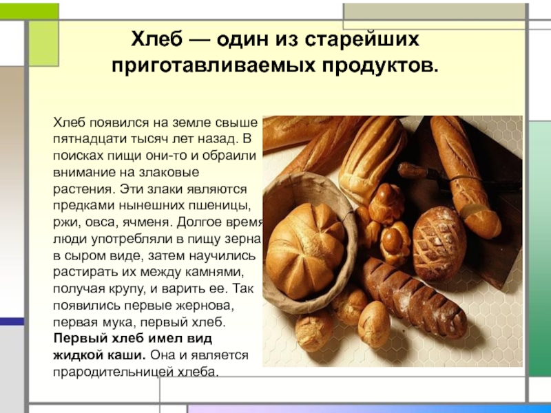 Слайд 2Хлеб — один из старейших приготавливаемых продуктов.