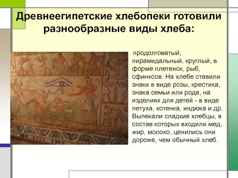 Слайд 4Древнеегипетские хлебопеки готовили разнообразные виды хлеба: