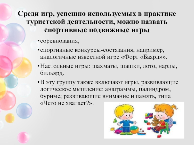 В эту группу также включают игры, развивающие логическое мышление: анаграммы, палиндром, буриме; развивающие внимание и память, типа «Чего не хватает?».