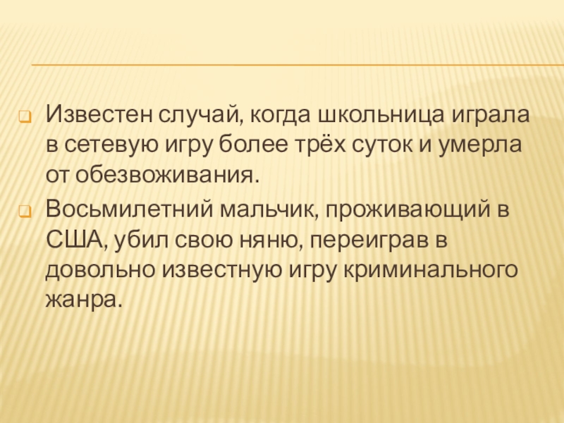 Слайд 7Известен случай, когда школьница играла в сетевую игру более трёх суток
