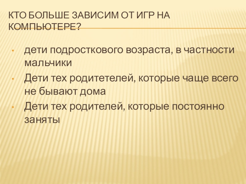 Кто больше зависим от игр на компьютере?дети подросткового возраста, в частности мальчикиДети тех родитетелей, которые чаще всего