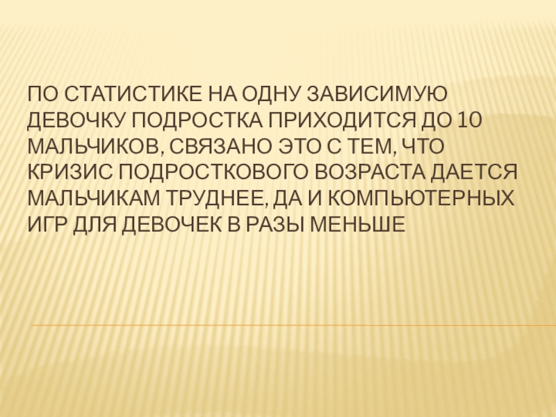 Слайд 6По статистике на одну зависимую девочку подростка приходится до 10 мальчиков,