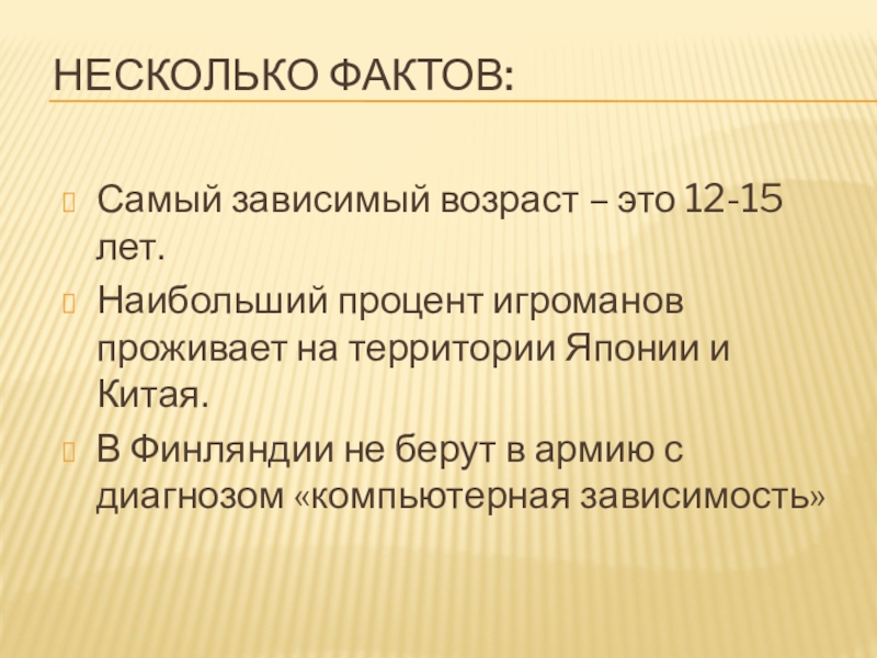 Несколько фактов:Самый зависимый возраст – это 12-15 лет.Наибольший процент игроманов проживает на территории Японии и Китая.В Финляндии