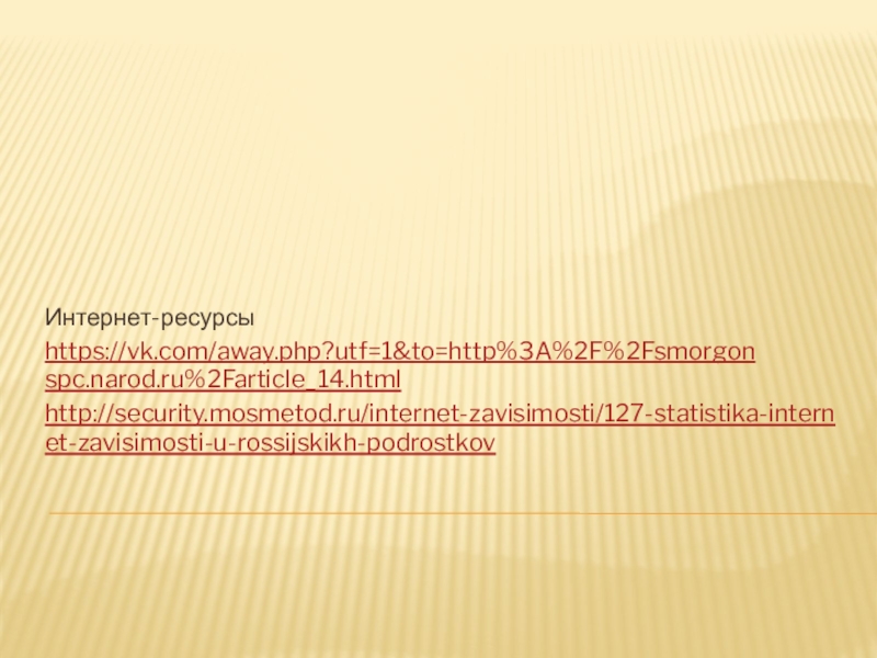 Интернет-ресурсыhttps://vk.com/away.php?utf=1&to=http%3A%2F%2Fsmorgon spc.narod.ru%2Farticle_14.htmlhttp://security.mosmetod.ru/internet-zavisimosti/127-statistika-internet-zavisimosti-u-rossijskikh-podrostkov