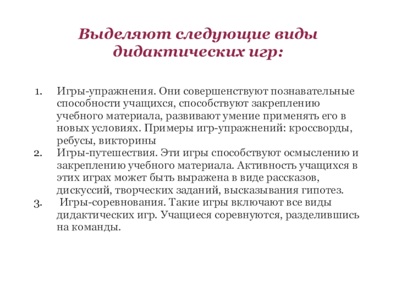 Игры-соревнования. Такие игры включают все виды дидактических игр. Учащиеся соревнуются, разделившись на команды.