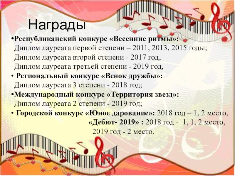 Диплом лауреата первой степени – 2011, 2013, 2015