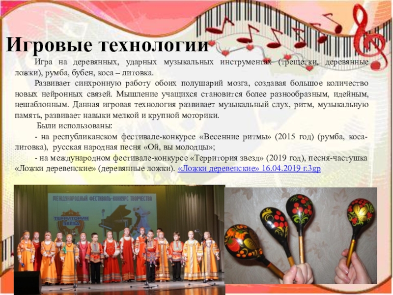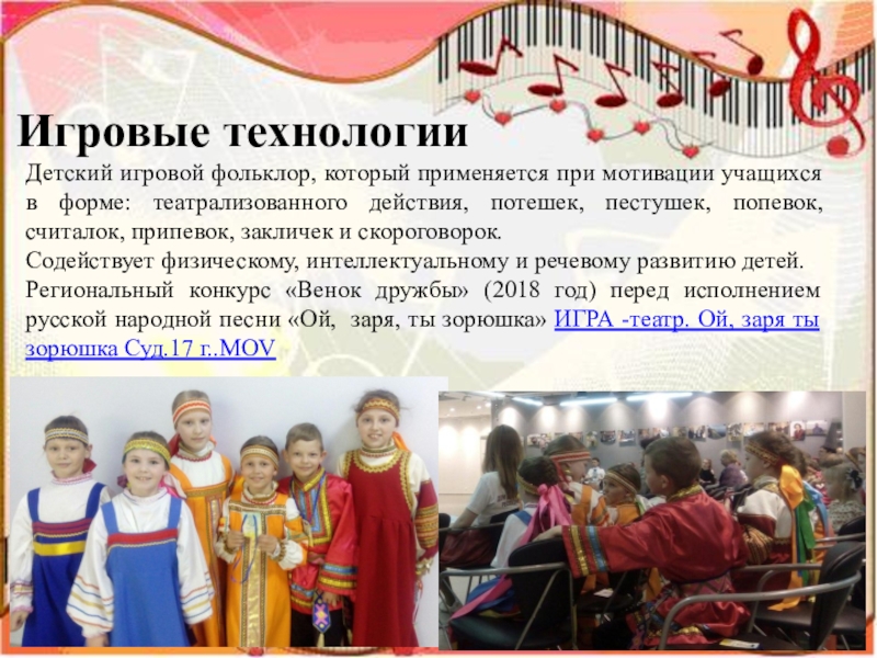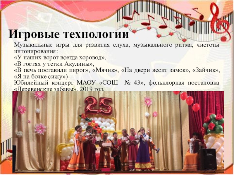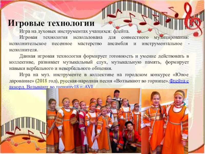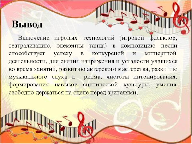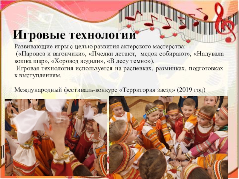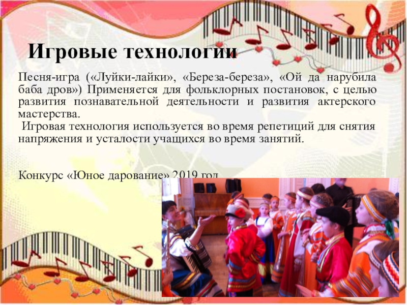 Включение игровых технологий (игровой фольклор, театрализацию, элементы танца) в композицию песни