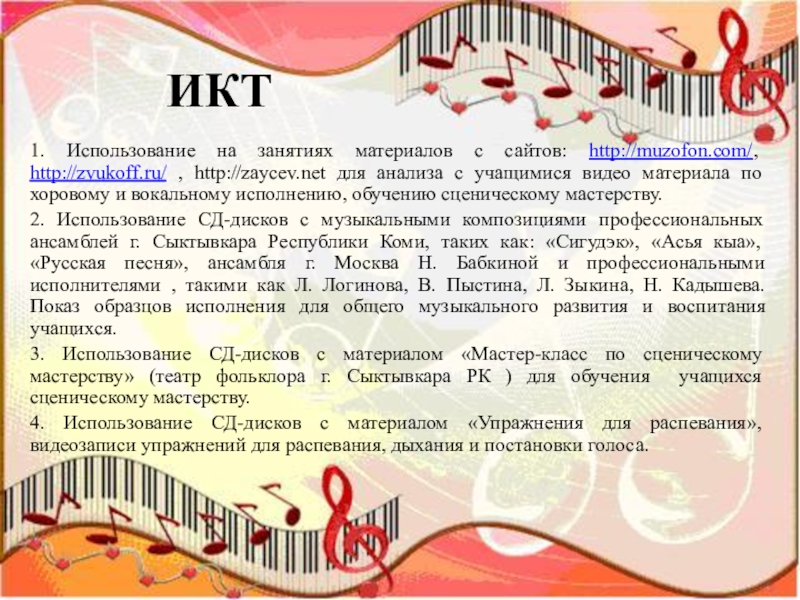 2. Использование СД-дисков с музыкальными композициями профессиональных ансамблей г. Сыктывкара Республики Коми, таких как: «Сигудэк», «Асья кыа», «Русская песня», ансамбля г. Москва Н. Бабкиной и профессиональными исполнителями , такими как Л. Логинова, В. Пыстина, Л. Зыкина, Н. Кадышева. Показ образцов исполнения для общего музыкального развития и воспитания учащихся.