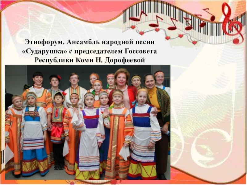 Слайд 4Этнофорум. Ансамбль народной песни «Сударушка» с председателем Госсовета Республики Коми Н.