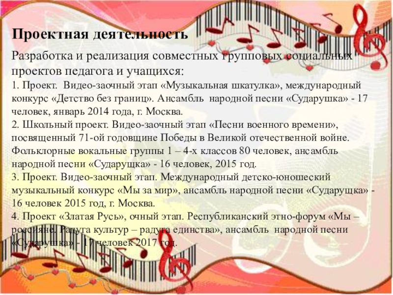 3. Проект. Видео-заочный этап. Международный детско-юношеский музыкальный конкурс «Мы за мир», ансамбль народной песни «Сударущка» - 16 человек 2015 год, г. Москва.