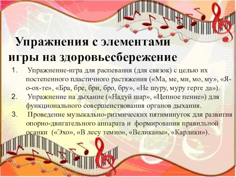 Слайд 8Упражнения с элементами игры на здоровьесбережение