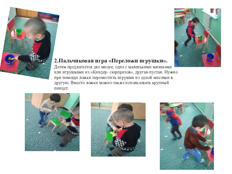 Слайд 102.Пальчиковая игра «Переложи игрушки». Детям предлагается две миски, одна с маленькими