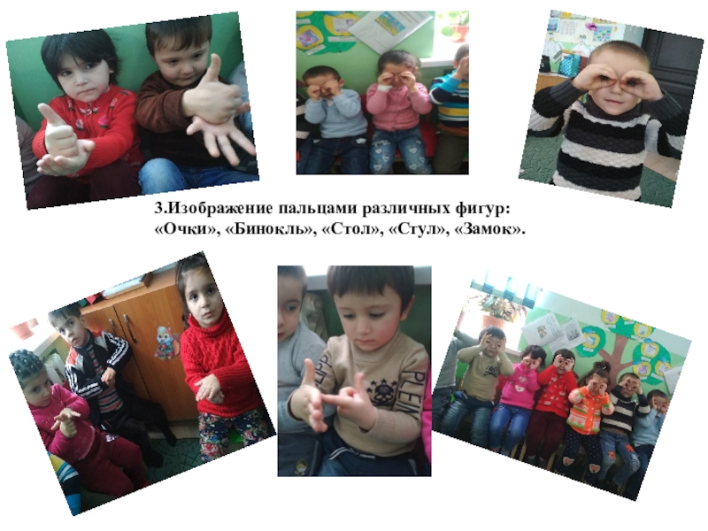 Слайд 113.Изображение пальцами различных фигур: «Очки», «Бинокль», «Стол», «Стул», «Замок».