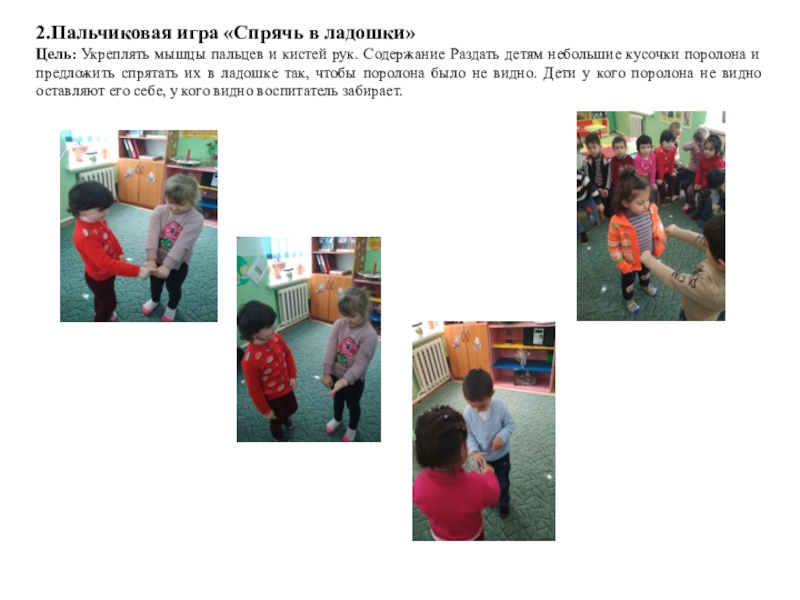 Содержание Раздать детям небольшие кусочки поролона и предложить спрятать их в ладошке так, чтобы поролона было не видно. Дети у кого поролона не видно оставляют его себе, у кого видно воспитатель забирает.