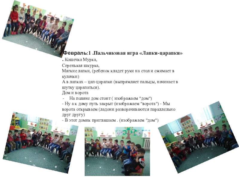Слайд 22 Февраль:1 .Пальчиковая игра «Лапки-царапки» . Кошечка Мурка,