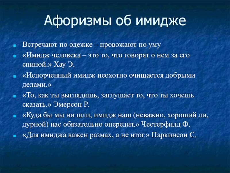 Афоризмы об имиджеВстречают по одежке – провожают по уму«Имидж человека – это то, что говорят о нем за его спиной.» Хау Э.«Испорченный имидж неохотно очищается добрыми делами.»«То, как ты выглядишь, заглушает то, что ты хочешь сказать.»