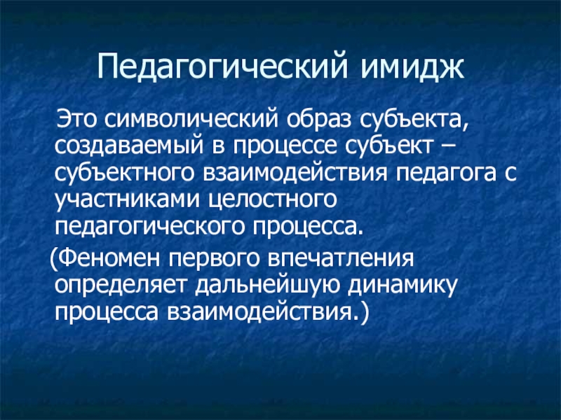 Педагогический имидж  Это символический образ субъекта, создаваемый в процессе субъект –субъектного взаимодействия педагога с участниками целостного
