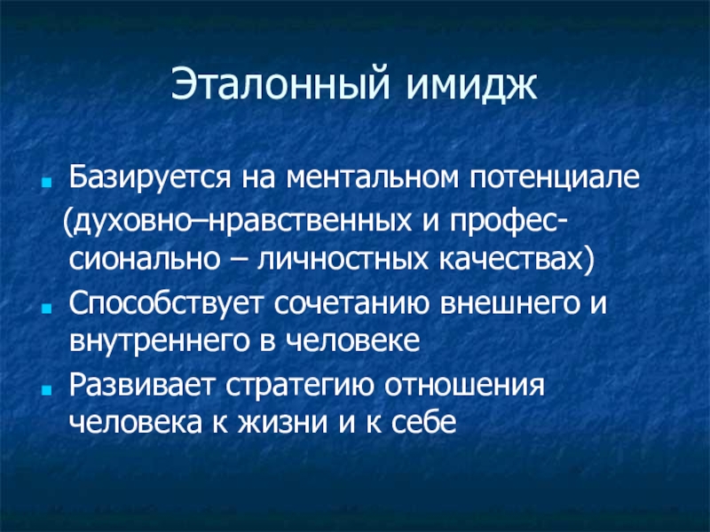 Эталонный имиджБазируется на ментальном потенциале (духовно–нравственных и профес- сионально – личностных качествах) Способствует сочетанию внешнего и внутреннего