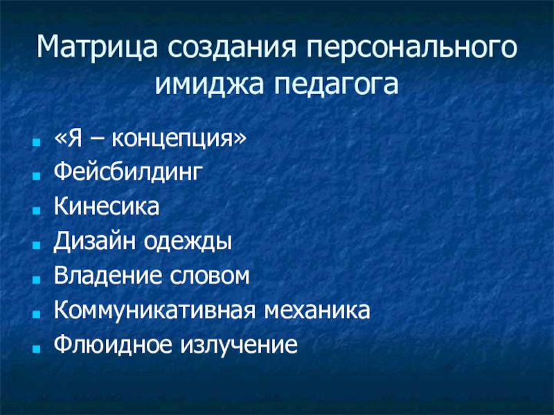 Матрица создания персонального имиджа педагога«Я – концепция»ФейсбилдингКинесикаДизайн одеждыВладение словомКоммуникативная механикаФлюидное излучение