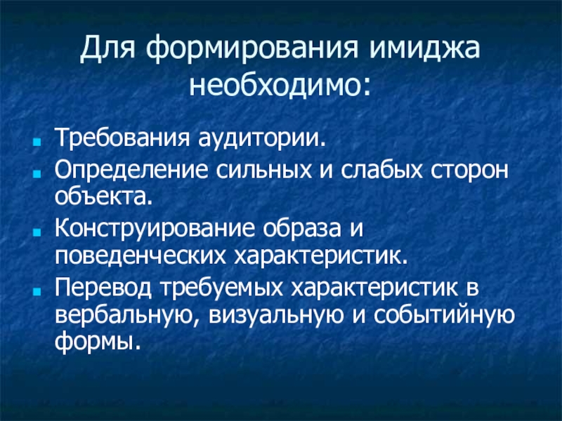 Для формирования имиджа необходимо:Требования аудитории.Определение сильных и слабых сторон объекта.Конструирование образа и поведенческих характеристик.Перевод требуемых характеристик в