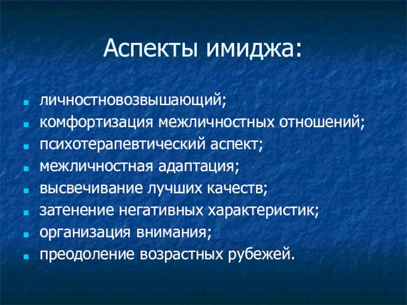 Аспекты имиджа:личностновозвышающий;комфортизация межличностных отношений;психотерапевтический аспект;межличностная адаптация;высвечивание лучших качеств;затенение негативных характеристик;организация внимания;преодоление возрастных рубежей.