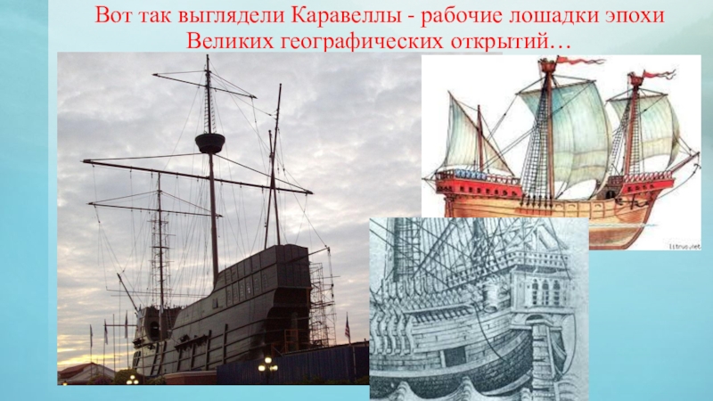 Слайд 5Вот так выглядели Каравеллы - рабочие лошадки эпохи Великих географических открытий…