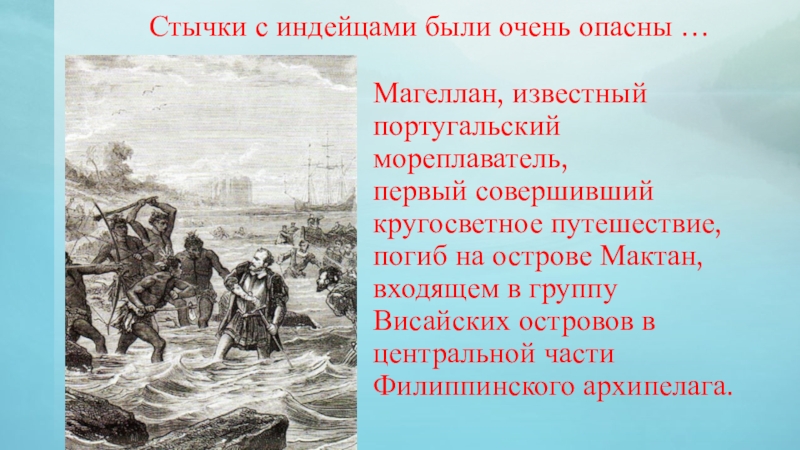 Стычки с индейцами были очень опасны …Магеллан, известный португальский мореплаватель, первый совершивший кругосветное путешествие, погиб на острове