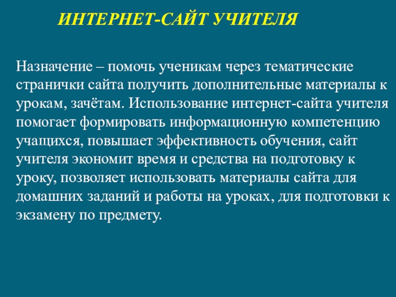 Назначение – помочь ученикам через тематические странички сайта получить дополнительные материалы к урокам, зачётам. Использование интернет-сайта учителя помогает формировать информационную компетенцию учащихся, повышает эффективность обучения, сайт учителя экономит время и средства на подготовку к уроку, позволяет использовать материалы сайта для домашних заданий и работы на уроках, для подготовки к экзамену по предмету.