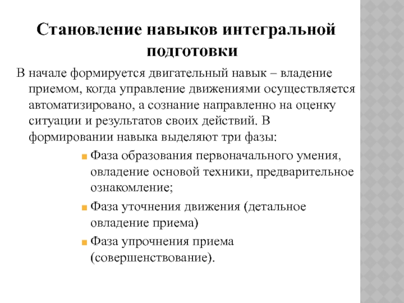 когда управление движениями осуществляется автоматизировано, а сознание направленно на оценку ситуации и результатов своих действий. В формировании навыка выделяют три фазы:
