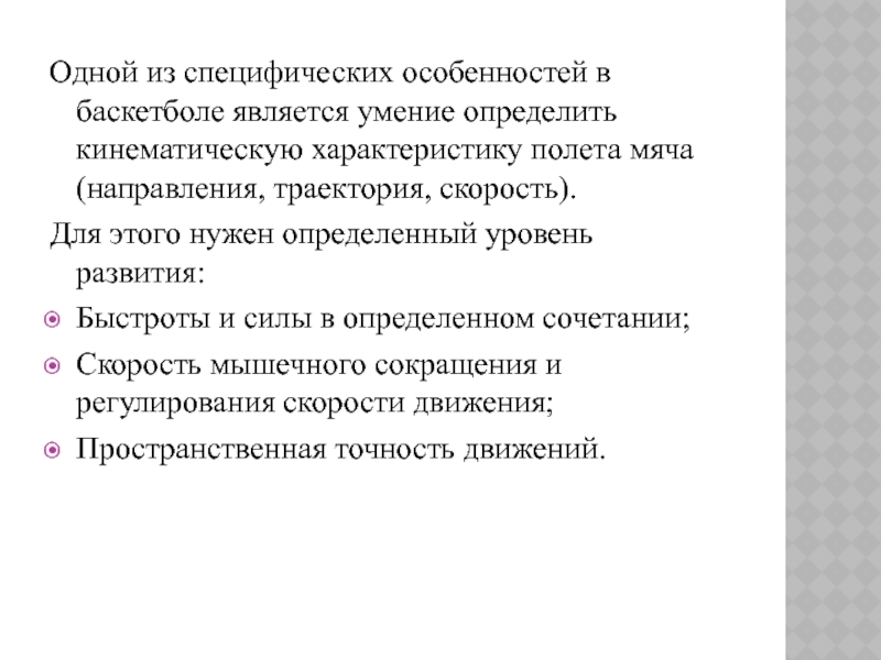 Слайд 2Одной из специфических особенностей в баскетболе является умение определить кинематическую характеристику