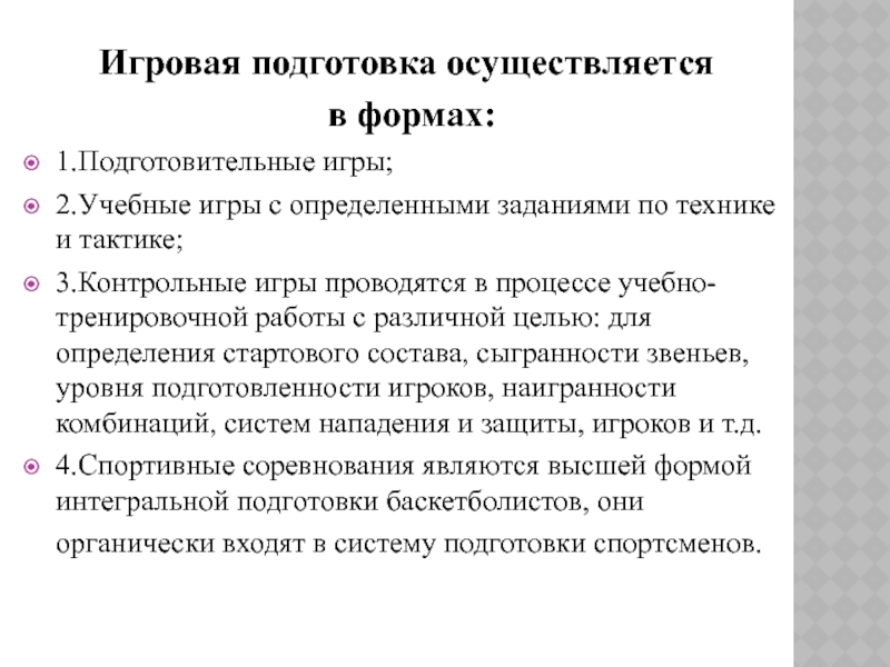 4.Спортивные соревнования являются высшей формой интегральной подготовки баскетболистов, они органически входят в систему подготовки спортсменов.