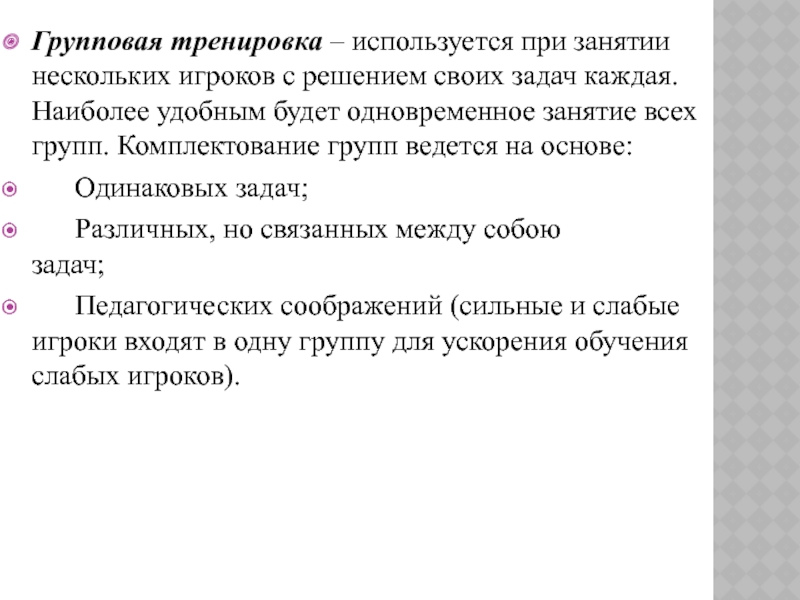 Слайд 10Групповая тренировка – используется при занятии нескольких игроков с решением своих