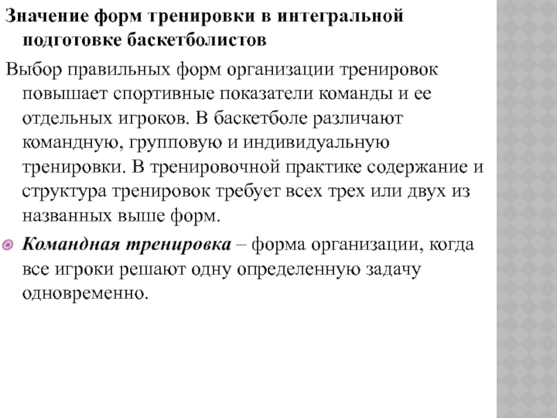 повышает спортивные показатели команды и ее отдельных игроков. В баскетболе различают командную, групповую и индивидуальную тренировки. В тренировочной практике содержание и структура тренировок требует всех трех или двух из названных выше форм.