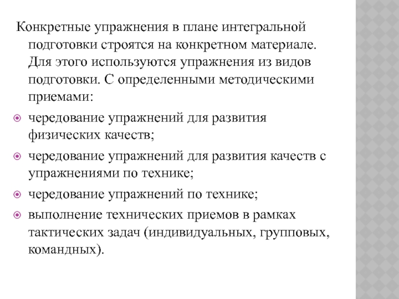 Слайд 4Конкретные упражнения в плане интегральной подготовки строятся на конкретном материале. Для