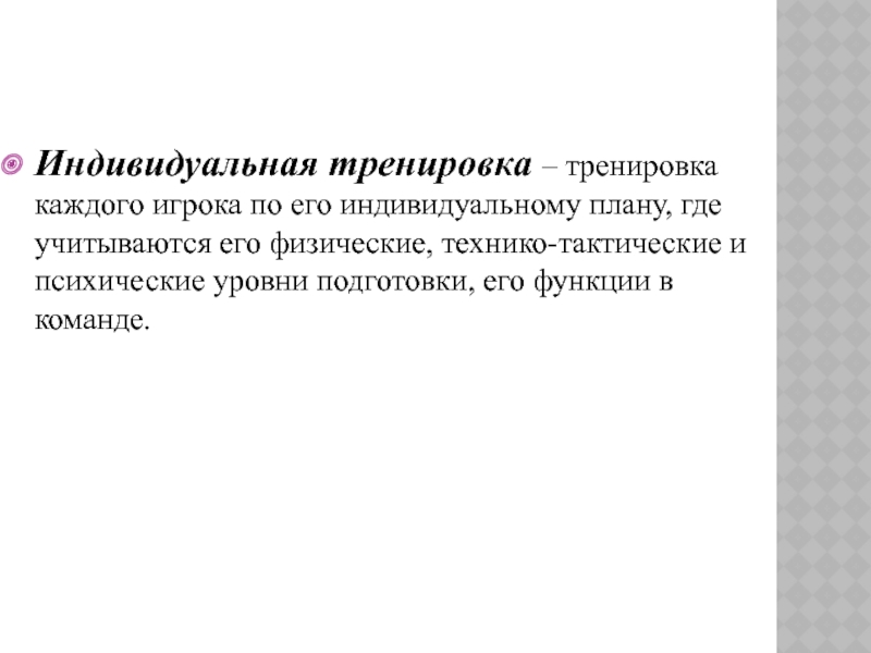 Индивидуальная тренировка – тренировка каждого игрока по его индивидуальному плану, где