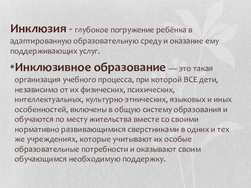 Инклюзивное образование — это такая организация учебного процесса, при которой ВСЕ дети, независимо от их физических, психических, интеллектуальных, культурно-этнических, языковых и иных особенностей, включены в общую систему образования и обучаются по месту жительства вместе со своими нормативно развивающимися сверстниками в одних и тех же учреждениях, которые учитывают их особые образовательные потребности и оказывают своим обучающимся необходимую поддержку.