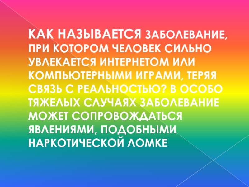 КАК НАЗЫВАЕТСЯ ЗАБОЛЕВАНИЕ, ПРИ КОТОРОМ ЧЕЛОВЕК СИЛЬНО УВЛЕКАЕТСЯ Интернетом или компьютерными играми, теряя связь с реальностью? В