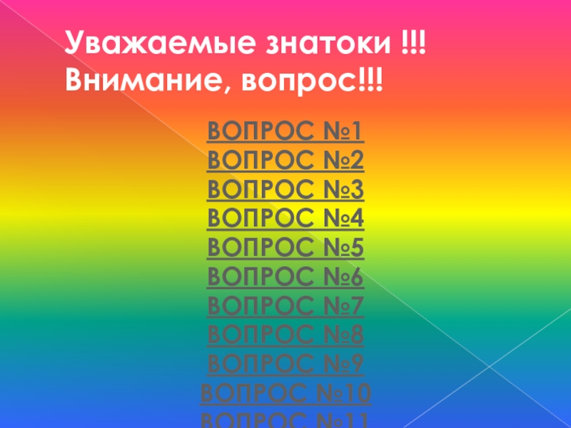 Слайд 11Уважаемые знатоки !!! Внимание, вопрос!!!
