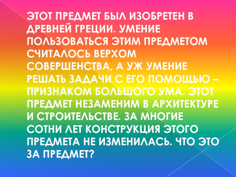 считалось верхом совершенства, а уж умение решать задачи с его помощью – признаком большого ума. Этот предмет незаменим в архитектуре и строительстве. За многие сотни лет конструкция этого предмета не изменилась. Что ЭТО ЗА ПРЕДМЕТ?